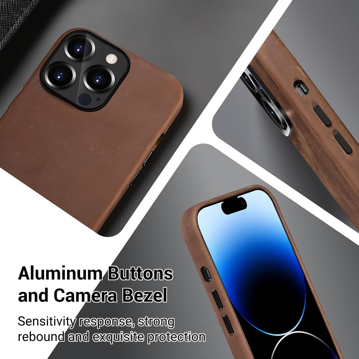 Belemay for iPhone 12 & 12 Pro Leather Case - Magsafe - Top Grain Vintage Crazy Horse Leather - Metal Buttons & Camera Bezel Bump - Slim Fit - Premium Phone Cover (6.1-inch) Tan Brown